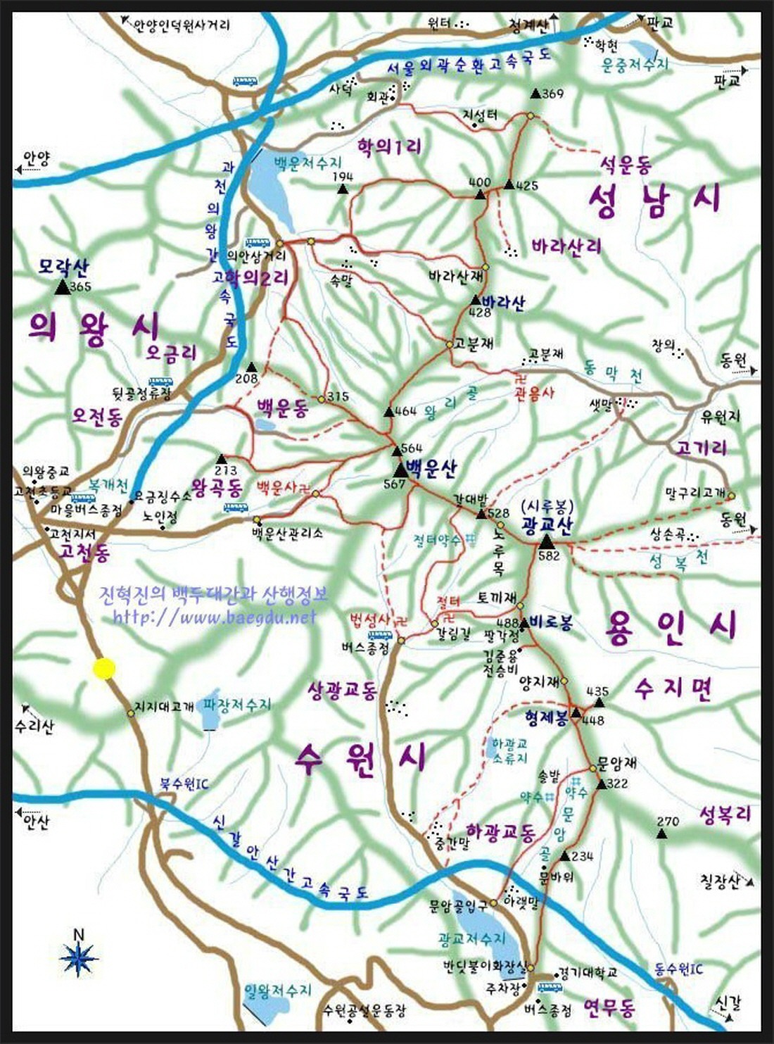 억새밭에서 백운산-바라산-우담산-영신봉-하오고개-국사봉-이수봉-석기봉-망경대-매봉-옥녀봉-굴바위산- 양재화물터미널까지다.